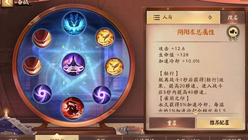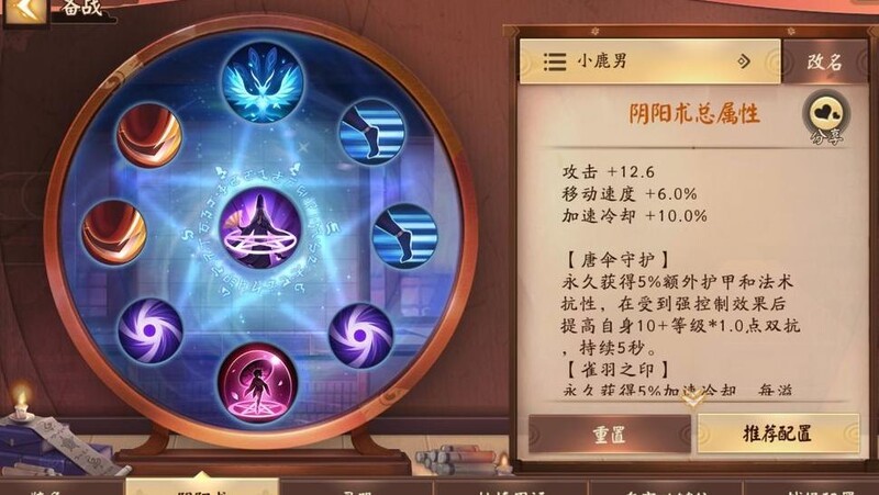 小鹿男擅长持续作战,团战中存活越久,二三技能释放频率越高,输出越可观。因此不推荐选择豹袭这类爆发型阴阳术。携带双物攻可提升技能伤害,也可搭配物攻与攻速以增强连招流畅性。轻行提高移速,利于快速支援;雀羽与减CD则配合装备和新阴阳术机制,实现更高输出循环。