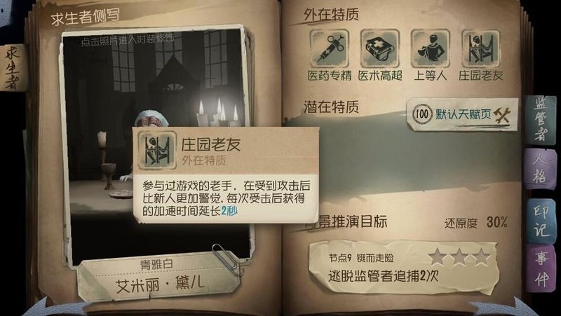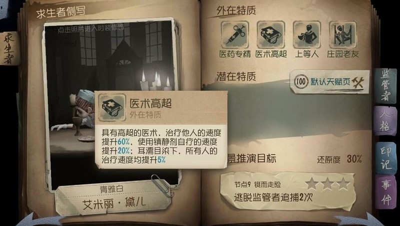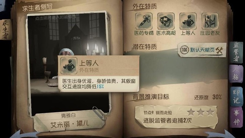 我们的医生艾米丽确实属于上等人。板窗交互速度仅降低15%,该增益已优化,削弱程度较轻,整体表现优秀。但需注意,在监管者附近仍不可随意进行交互操作,否则仍有概率触发恐惧震慑。面对新手玩家,宁可承受一次伤害后撤退,也不应急于翻越板窗,避免因小失大,造成更大劣势。