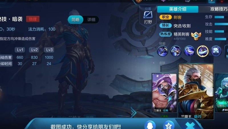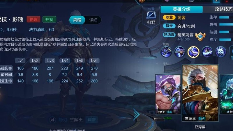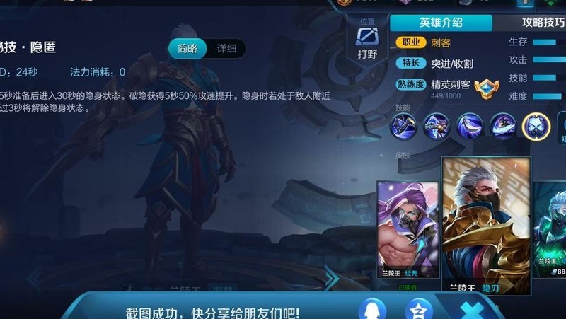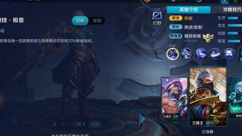 新版兰陵王一级便能使用四技能进入隐身状态。