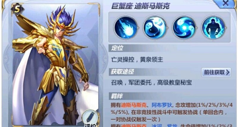 在圣斗士星矢(腾讯)中,巨蟹座迪斯马斯克掌控亡灵与黄泉之力,攻守兼备,是后期爆发核心。召唤亡魂、多次行动、群体输出与回复集于一身,堪称全能型S级斗士。