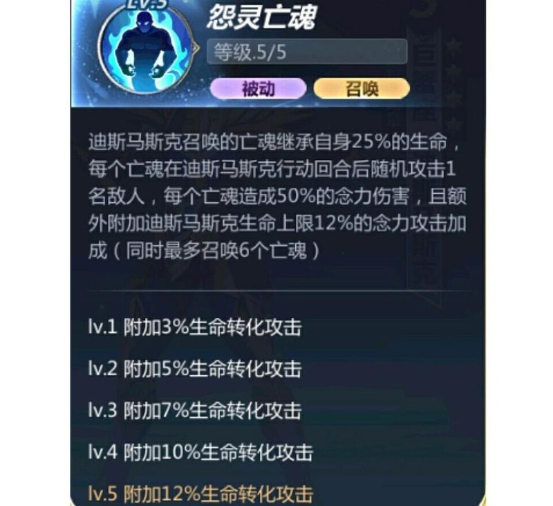 迪斯马斯克可召唤最多6个亡魂,每个继承其25%生命值。每回合行动结束后,亡魂会随机攻击一名敌人,造成相当于其念力伤害50%的攻击,并额外附加迪斯马斯克最大生命值1%至5%的念力伤害加成,具体数值随技能等级提升而增加,所有亡魂协同作战,持续施压敌方阵容。