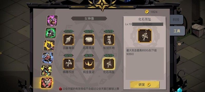 可加入高等级工会,积累贡献币用于解锁女神像中的化石耳坠。