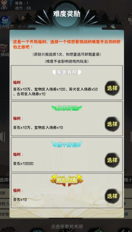 进入游戏后,记得先在左上角中选定一个难度。该选择不会影响游戏内的数值机制,仅决定开局奖励的多少。难度越低,初始奖励越丰厚,有助于更快度过开荒阶段。若想挑战极致体验,可尝试选择最后一个最高难度。
