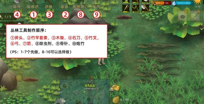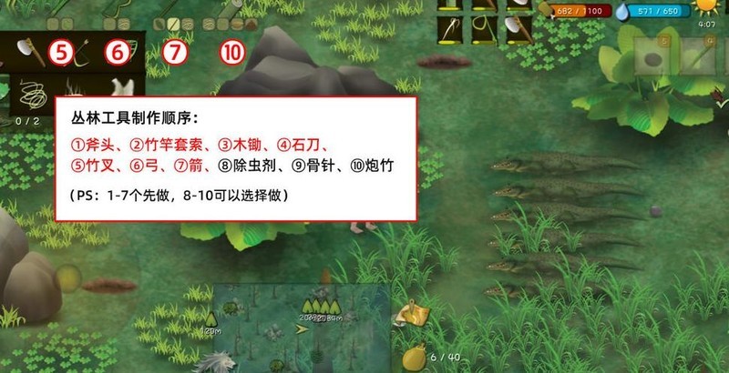开局工具制作顺序为:先做斧头,接着竹竿套索、木锄、石刀、竹叉、弓、箭,再制除虫剂、骨针,最后制作炮竹。