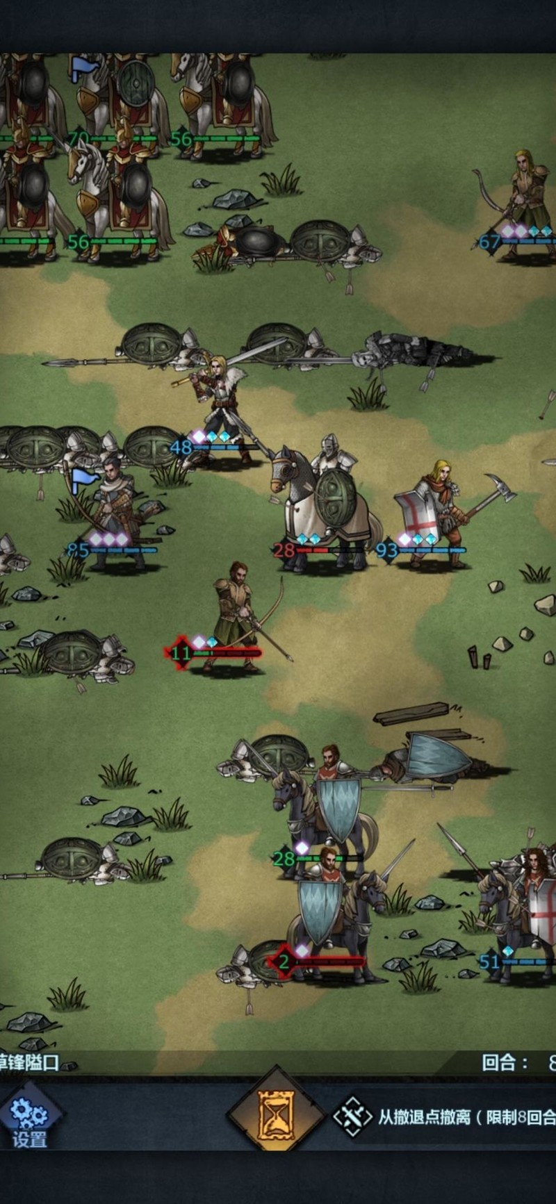 剧情推进至草风溢口撤离阶段(第八回合),小公主独自冲向底部敌人,吸引高伤害骑士攻击,引发后续敌群围攻。其余队员先行清理右侧目标,待全部解决后再返回支援,完成整体作战部署。