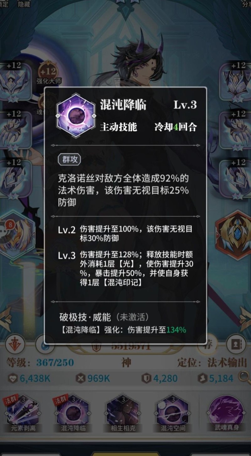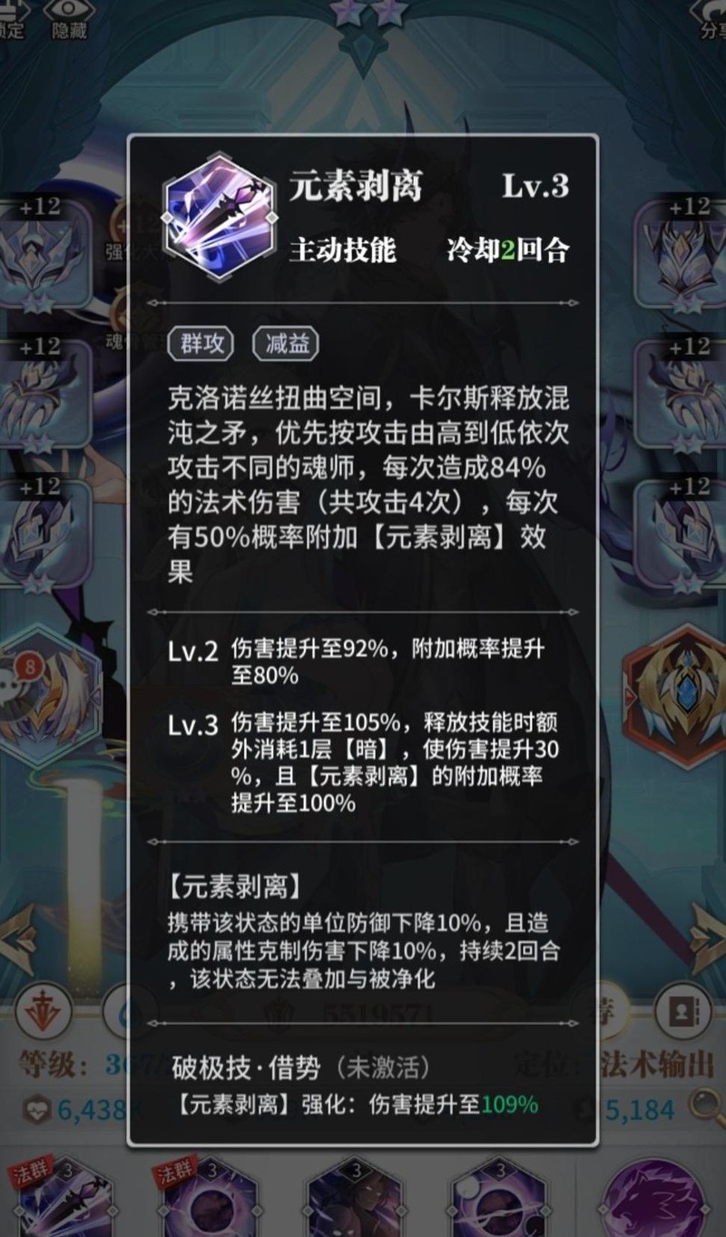 一技能元素剥离兼具输出与辅助效果,可按攻击力由高至低为敌方四名魂师施加元素剥离状态。混沌魂师基础速度与光暗系相当,除风系高速魂师外,通常可先手释放。该状态无法被清除,能降低目标10%防御力及10%克制属性伤害,有效削弱敌方输出能力,提升己方战斗优势。