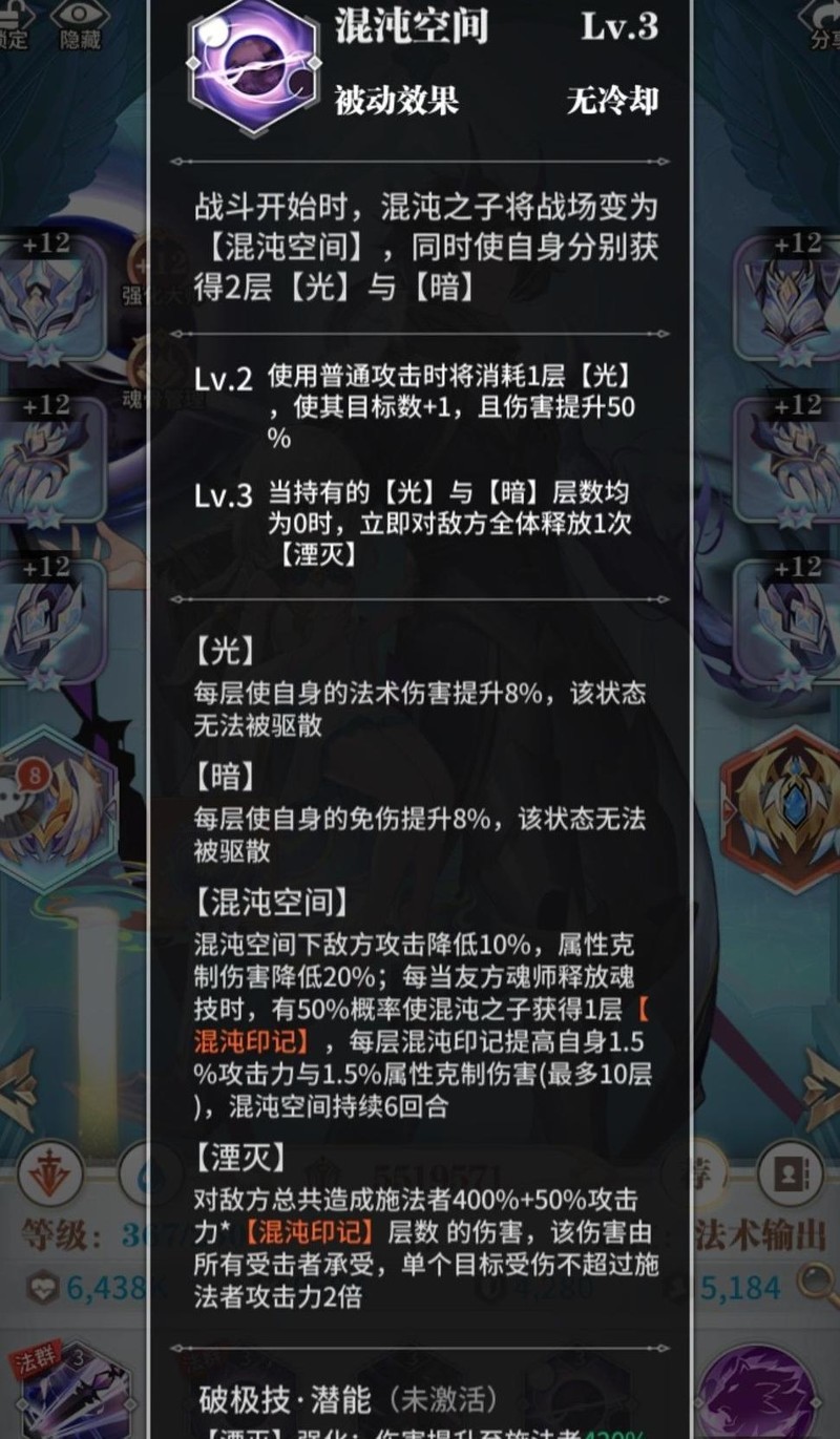 四技能混沌空间表现极为出色,激活三星神器后,开局即可获得四层增益效果,并构建独特的领域环境。每层光印记提供8%法术伤害加成,每层暗印记提供8%减伤效果;在三星神器加持下,光印记转化为12%法术伤害与10%暴击率,暗印记则提升至15%减伤和10%抗控能力。战斗开始后的六回合内,敌方全体魂师的攻击力降低10%,并减少20%属性克制伤害。同时,该技能可叠加混沌印记,最多叠加至自身15%攻击力与15%克制伤害提升。此外,附带湮灭被动效果,显著增强持续输出能力。当光暗印记全部消耗后,可触发一次强力攻击,配合三星神器时爆发伤害极为惊人。