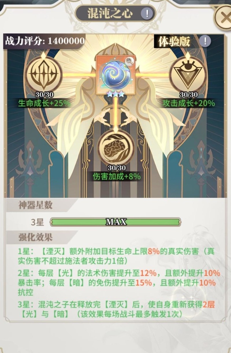 混沌之子的神器每一级提升都极为实用,毫无废柴加成。一星时湮灭被动可附加敌人最大生命值8%的真实伤害;二星增强光暗印记属性;三星则将技能循环从四回合延长至八回合,大幅提升持续作战能力。建议优先升至三星,凡抽取该魂师,务必培养其神器至三星,以充分发挥战力优势。
