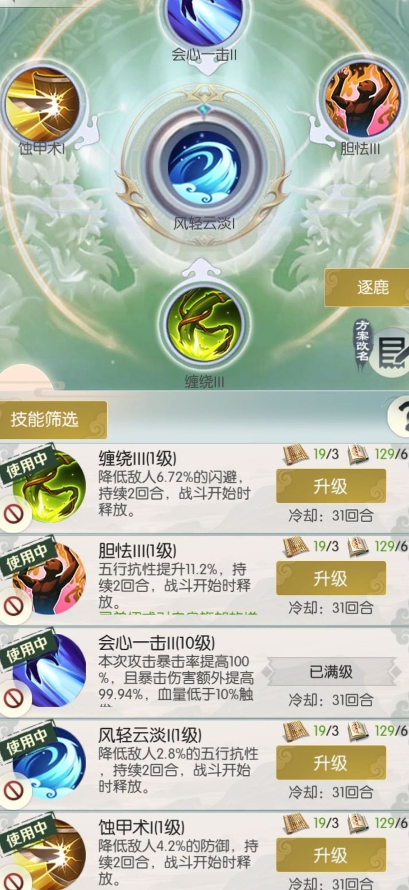 若灵兽技能拥有会心三效果,等级满后输出通常足够;仅有会心二时,则需在等级拉满基础上搭配其他增伤技能,仅会心一的情况下输出较难保障,更依赖属性支撑。推荐配置风轻云淡与蚀甲术,其余技能可根据自身需求调整。若生存压力大,可选择减伤或回血类技能;若输出不足,则优先考虑提升伤害或降低目标抗性。本人使用至圣流派,仅拥有睁目三重,为防止第二击未能触发闪避,故搭配缠绕技能确保控制衔接。若有天罡战意三等提供50%技能释放概率的被动,可将主五技能置于第二顺位以获取技能加成收益。