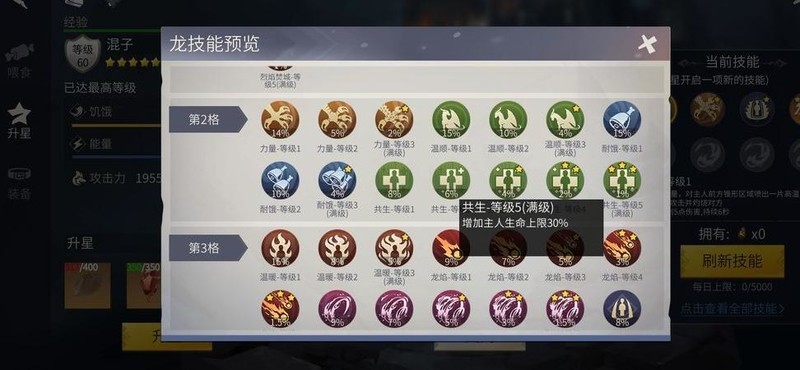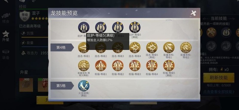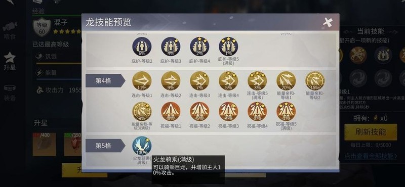 推荐技能搭配:一技能选范围伤害,二技能选生命共生,三技能选防御庇护,四技能选攻击祝福,五技能仅推荐火龙的攻击增益(骑龙状态)。