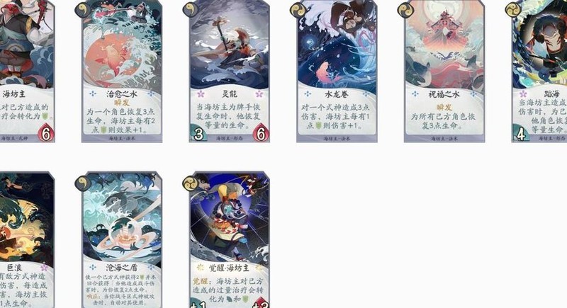 海坊主主要依赖祝福之水和蹈海这两张群体回复卡进行配合,尤其在后期若能实现蹈海衔接觉醒的连招,仅一次攻击便可打出极强节奏。然而,由于海坊主缺乏过牌手段,Combo组建难度较高,且其强度尚不足以支撑专门围绕它构建整套卡组,因此该组合在实战中并不常见。