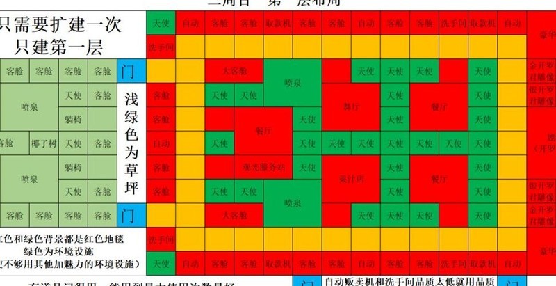 布局图及一周目攻略:橙色为波斯地毯,红色代表红色地毯,绿色为环境设施,浅绿色表示草坪。