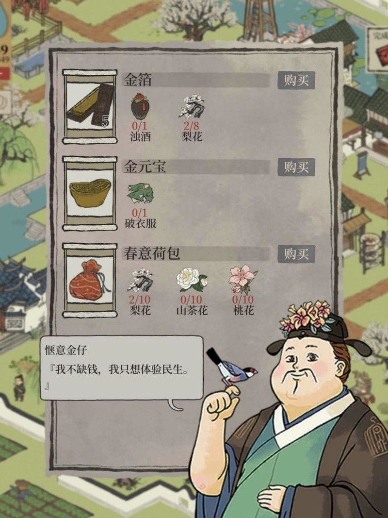 金箔需浊酒一瓶,含梅花三朵并减体力二十,另加梨花八朵。