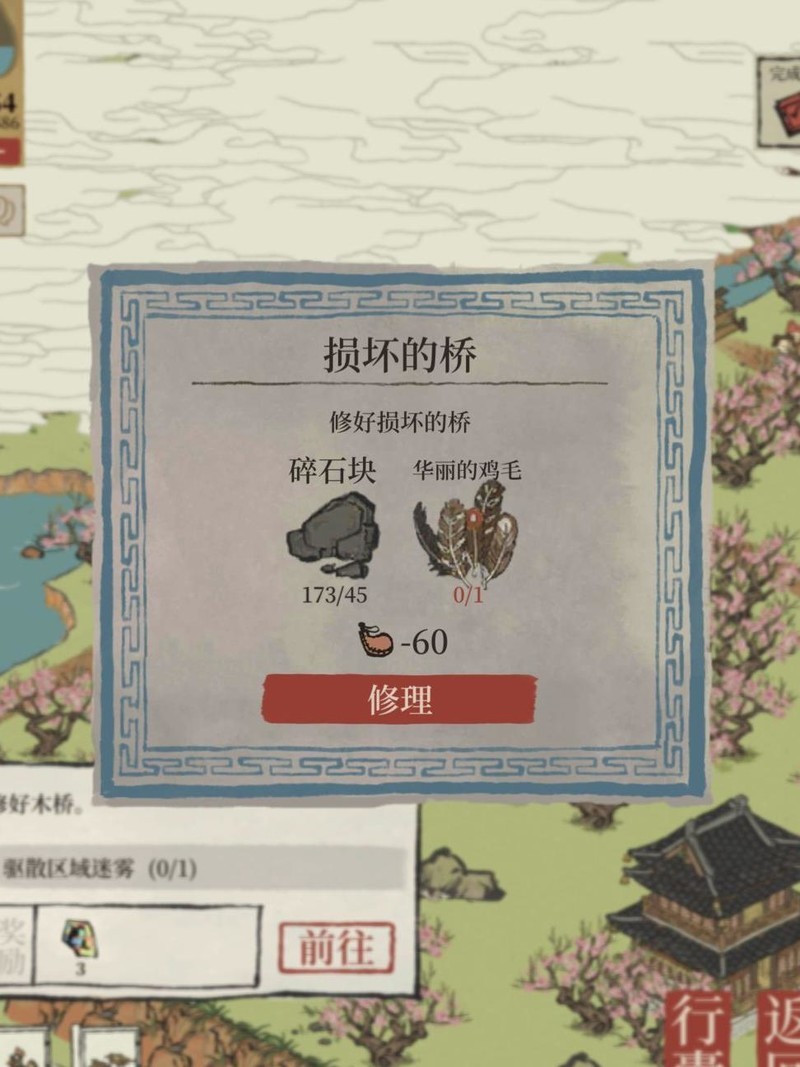 消耗45碎石块与华丽鸡毛,扣除60体力。