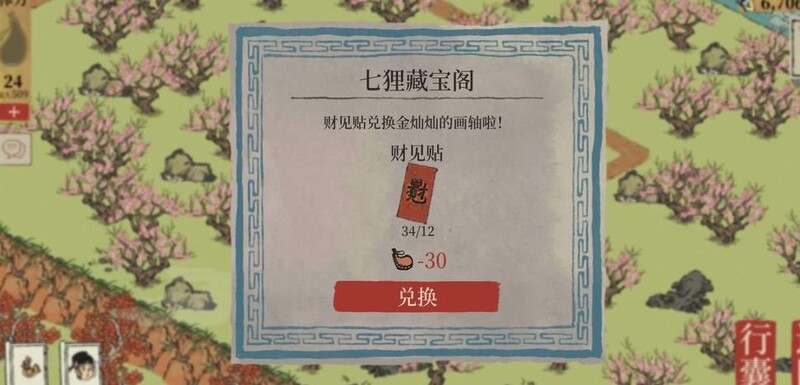桃花林与迷宫迷雾后的七狸藏宝阁支持财见贴兑换,可换取金画轴、补天石及铜钱等奖励。