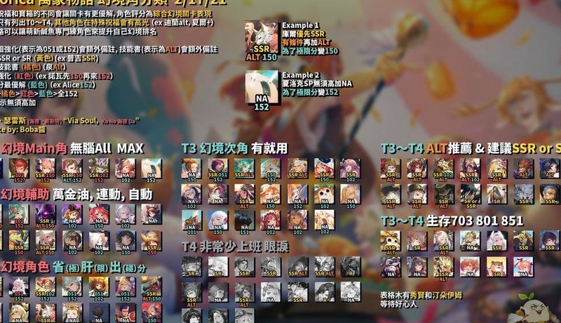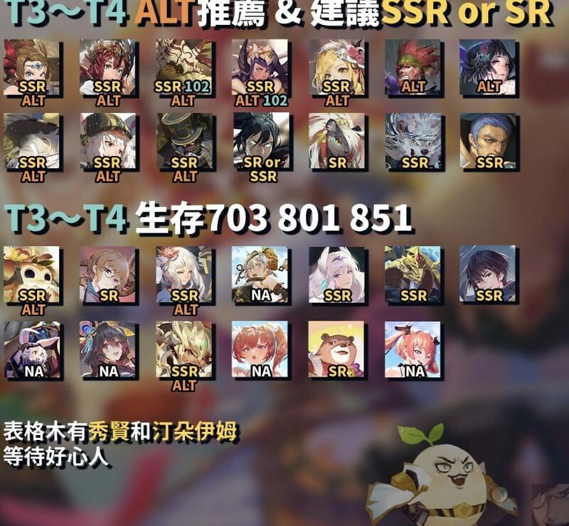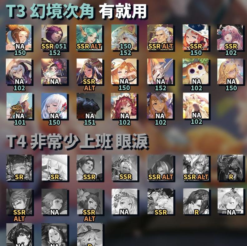 角色仅标注T0至T4级别,其余角色在特殊祝福下亦有亮眼表现,如迪兰alt、夏尔+等。