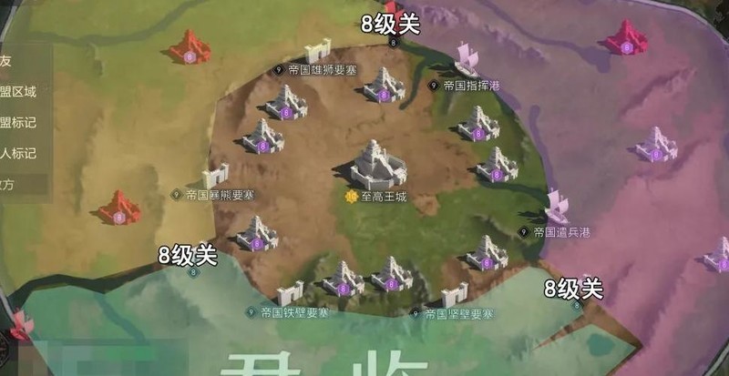 优先请求盟友支援,协助打通八级关卡,助你拿下中心区域关卡的备战区,将主堡全部迁移至此即可。八级要塞暂不必强求,即便在盟友帮助下占领,他们撤离后你也难以守住,耗时费力且成效有限。只要能在关卡前线成功落堡,便已达成目标。
