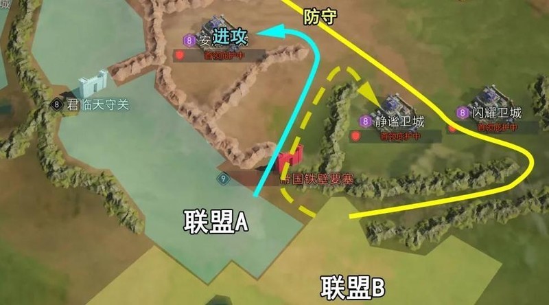 当己方与友盟均处于劣势时,应果断取舍,放弃部分战区。优先选择拥有缓速通道的一侧联合进攻,切勿坚持各自占据关口同步推进,对方不会给这样的机会。集中力量才能突破困境。