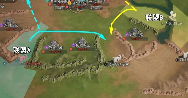 待中心区开放后,联盟A迅速攻占关口并直取一座8级城。联盟B则经缓速通道进入,负责抵御骚扰之敌。待A稳固据点后,B随即进攻其关口进入,双方依此模式协同推进,再次联手攻下另一座8级城池。
