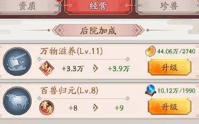 经营相关的属性加成需在加入家族并开启后院后才能获得。升级所需材料主要来源于后院产出物品的售卖所得。万物滋养用于提升赚钱速度,消耗的灵豆可通过出售农作物获取;百兽归元每升一级增加1点资质,升级消耗的兽元则通过贩卖饲养的动物获得。