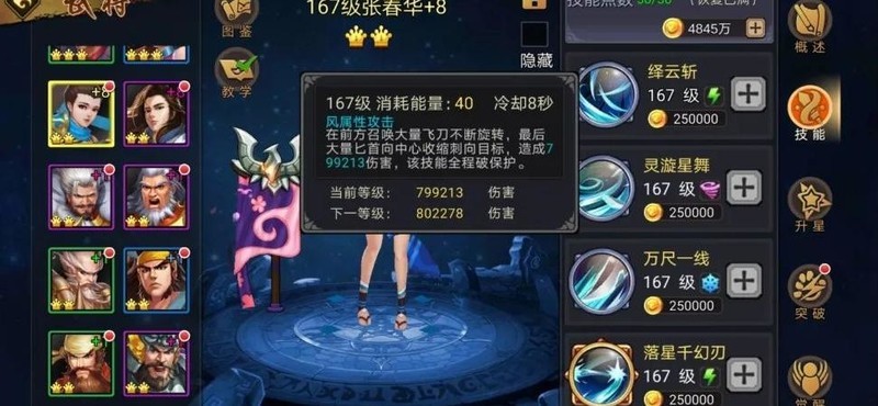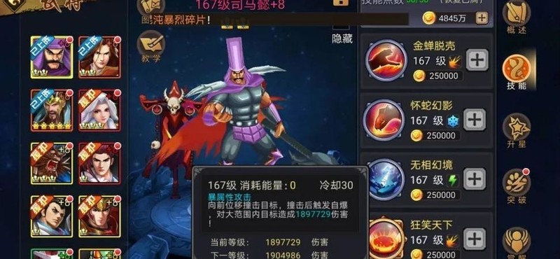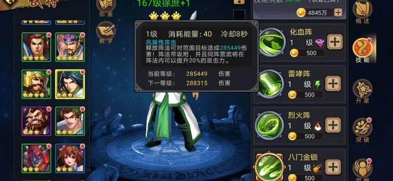 狂风式无需赘述,体验过的都清楚其强大之处。作为单体技能中伤害最高的存在,尤其对阵冰属性武将时,输出堪比他人两个技能之和。常被忽视的是,它仅消耗30点法力,施法速度快,属于瞬发高爆发类型,非持续伤害,实战中极具优势。