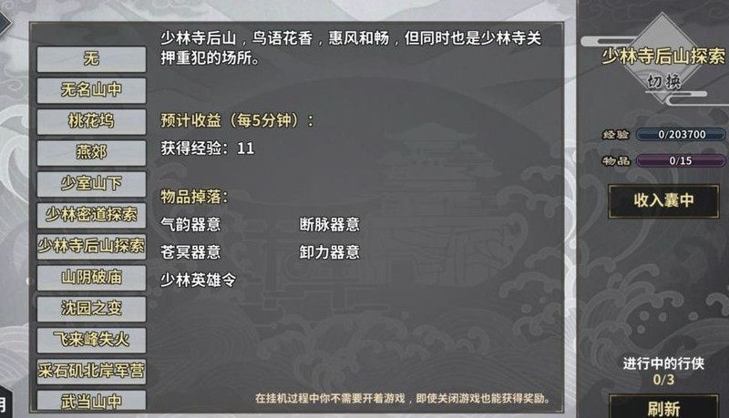 行侠任务分为12小时、16小时和20小时三种时长,每次最多可派遣三名侠客参与。与以往不同,当前版本中多次派遣不会缩短行侠所需时间。