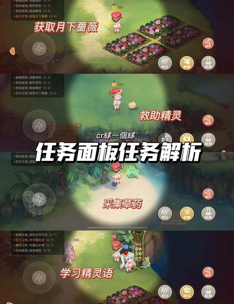 右侧界面将显示任务列表,玩家可按提示完成各项任务,如采摘月下蔷薇、采集草药、救助精灵及学习精灵语。