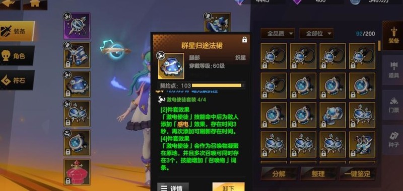这套打法整体节奏非常快,几乎在赶路的过程中就能顺手清理掉怪物,效率极高。唯一需要注意的是面对boss时要集中注意力,留意技能释放的时机,避免被高伤害技能命中导致猝死。除此之外,操作上并不需要频繁点击技能,整体较为轻松省力,长时间使用也不容易感到疲惫或犯困(相比之下,之前某些玩法确实容易让人眼花缭乱、昏昏欲睡)。当然,这套配置仍有提升空间。例如,当契约点达到880以上时,可以开启第7个孔位,进一步提升闪电链的输出能力。我个人尚未开启,主要是因为符文上同时堆叠契约点和能量回复属性难度较大,因此优先保障了回能效果,契约点后续再逐步完善。此外,若能量循环难以满足,也可以考虑动能流派方向:通过天赋选择减少位移技能消耗,并为闪电链、使徒或护盾搭配闪击类契约石,实现流畅的能量周转。整体扩展性较强。唯一的不足在于成型条件较为严苛:一是过载触发几率需尽可能洗高,二是为了保证施法手感,必须达成1释放4或2释放4的配置。这两点无法回避,必须设法解决才能发挥全部实力。