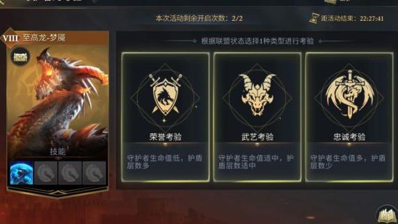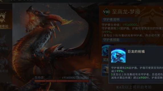 每个难度下可从三种考验中任选其一进行挑战。荣誉考验中的至高龙血量最少,但护盾层数最多。在护盾未被打破前,对其造成的伤害减少99%。当五支及以上队伍联合攻击守护者,并累计造成一定数值的真实伤害(经减免后计算,难度越高,所需伤害值越大)时,可削减一层护盾。