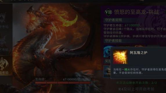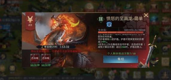 挑战守护者必须通过集结进攻,每位领主仅有10次挑战机会。由于至高龙拥有大量护盾,清除护盾将消耗较多次数。建议由战力较低的领主负责破除护盾,节省高战领主的挑战次数,待护盾消失后,由高战领主集中力量在关键时刻完成对至高龙的击杀,以确保战斗效率与成功概率。