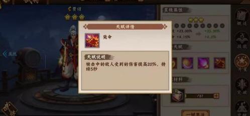 贾诩在排位赛中主要依赖一技能的控制效果,搭配二技能的增益和三技能爆发伤害,整套连招威力巨大,往往能让对手重伤甚至直接击杀。因此,解锁四星天赋速死显得尤为关键,能进一步提升其输出效率,确保技能衔接后迅速终结敌人,是发挥其最强战力的核心配置。