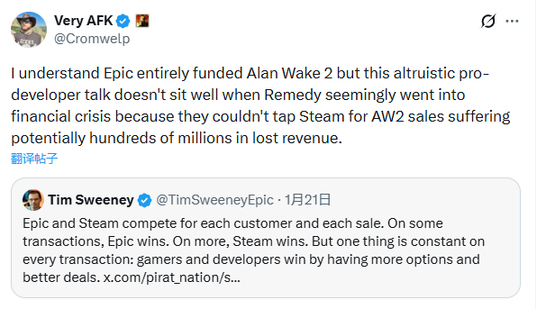 该负责人指出:“虽然Epic为项目提供了全额资金支持,但当一家开发商因无法在主流平台销售作品而出现财务压力时,所谓的‘保护创作者’理念就显得难以自洽。” 他进一步分析称,由于未能登陆拥有庞大用户基数的Steam平台,该作可能错失了数亿美元的潜在销售额。即便需要支付平台抽成,更广泛的发行渠道本应有助于加快回本节奏,提升整体收益。