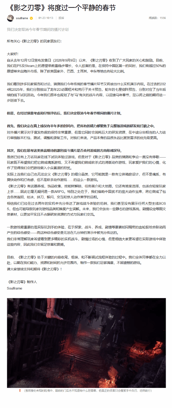 就在刚刚,影之刃零制作人梁其伟发布消息,宣布原定于2026年春节期间公开的实机播片计划将正式取消。他提到,团队决定让游戏在这个传统节日期间保持沉静,集中力量推进开发工作。