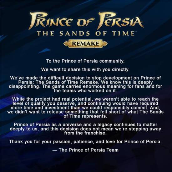 今日上午,育碧正式确认终止波斯王子:时之砂重制版的开发工作。这一决定令全球大量长期关注该项目的玩家深感震惊与失落。