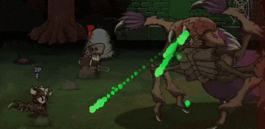 恶魔蜘蛛会昂首向前方中距离区域喷出绿色毒液,攻击范围较广,造成中等伤害。需要注意的是,释放此技能时,其周围近身位置反而处于攻击盲区,不会受到毒液影响。