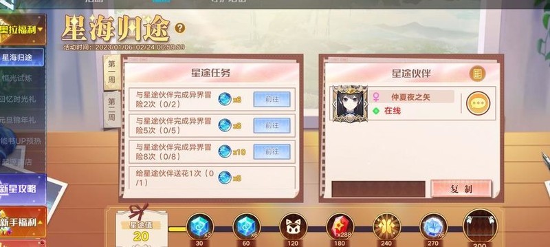 第一周任务可得90星途值,若第二周完成相同任务,总计可达180星途值,部分任务需与星途伙伴共同完成。