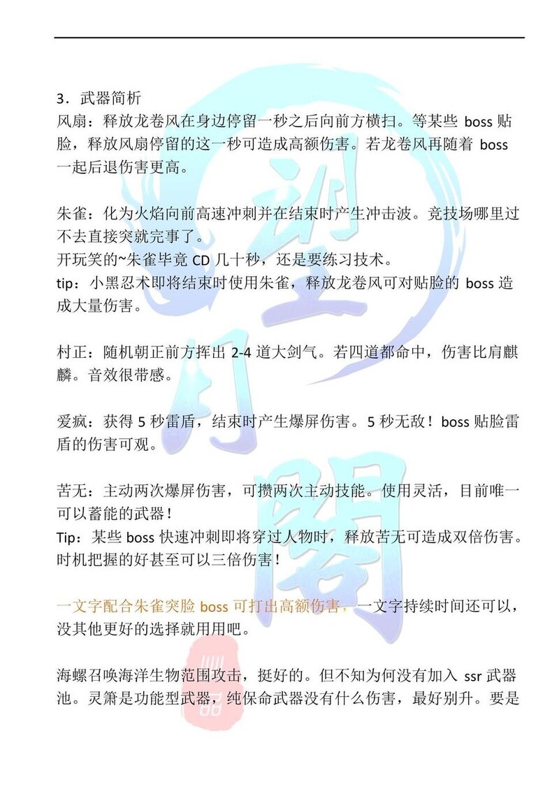 个人觉得,苦无和风扇属于四人通用的主武器。苍牙最适合用风扇、村正或苦无,小黑则首选朱雀火扇,次选普通火扇。琳以苦无为佳,海螺也可接受。阿力推荐一文字或麒麟。副武器依个人习惯选择,我偏好具备生存能力的类型,如一文字、苦无或海螺。主武器最好能契合角色属性并享受天赋加成,若无也无需强求,略有影响但可接受。当前版本朱雀已被调整,撞墙会停下,虽削弱但仍具较强实力。具体机制建议咨询官方获取准确信息。