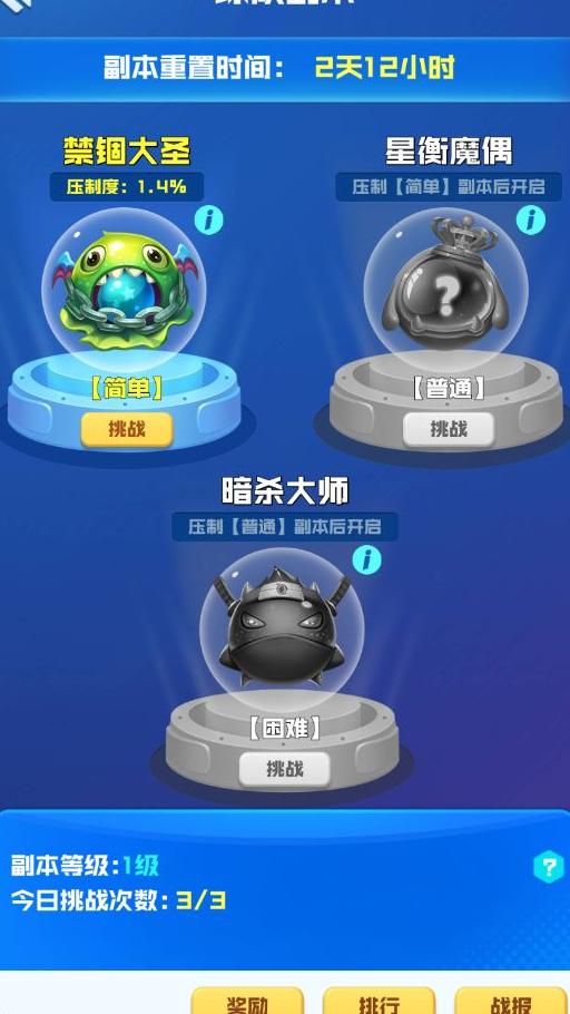 每周开放三个不同难度的单人副本供挑战,分别为简单、普通和困难,难度越高,怪物血量越多。