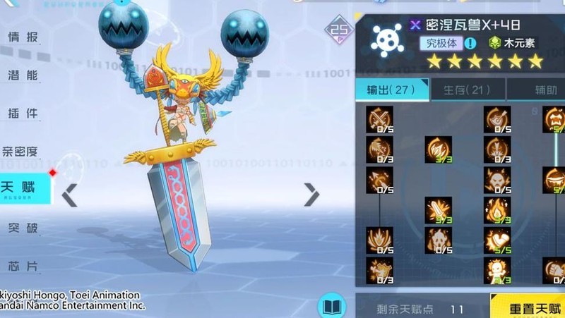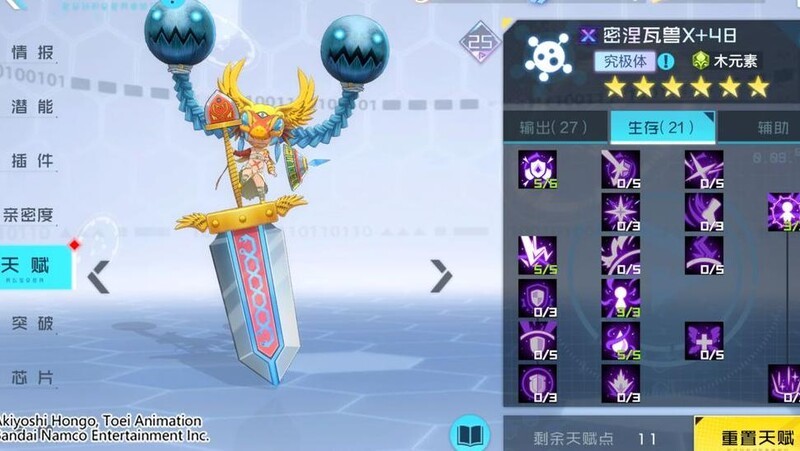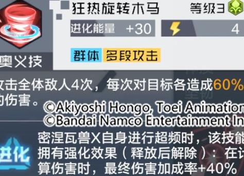 密涅瓦兽X是游戏中木属性数码宝贝中擅长群体输出的强力角色。其奥义技能可对敌方全体发动多次攻击,造成高额直接伤害。得意技在自身暴击时能大幅无视对手防御,若目标处于中毒状态,还能进一步降低其防御抵抗能力。被动技能不仅大幅提升自身伤害输出,还限制所受单次伤害不超过生命上限的一定比例。此外,每次攻击时还可将部分伤害转化为自身治疗,具备良好的持续作战能力与生存续航。