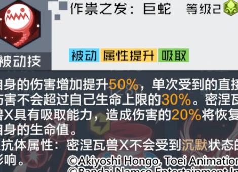 从技能机制来看,密涅瓦兽X展现出极为出色的战斗能力。其普通技能可百分百驱散敌方增益状态,有效削弱对手战力。奥义技能具备对全体敌人发动多次打击的能力,输出覆盖面广,适合清理密集阵容。得意技在触发暴击时,不仅能无视目标一定比例的防御,还能进一步降低已处于中毒状态敌人的防御属性,显著提升伤害效率。被动方面,该数码兽免疫沉默效果,并能持续增强自身输出能力,同时具备伤害上限防护机制,单次所受直接伤害不会超过生命值上限的特定比例,极大提升了生存能力。此外,密涅瓦兽X拥有吸血机制,攻击造成伤害的一部分将转化为自身生命回复,续航能力出色。综合来看,它是一位兼具高爆发、稳定输出与一定生存能力的群体伤害型数码宝贝,在团队作战中能够发挥关键作用,非常值得纳入主力阵容进行培养和使用。