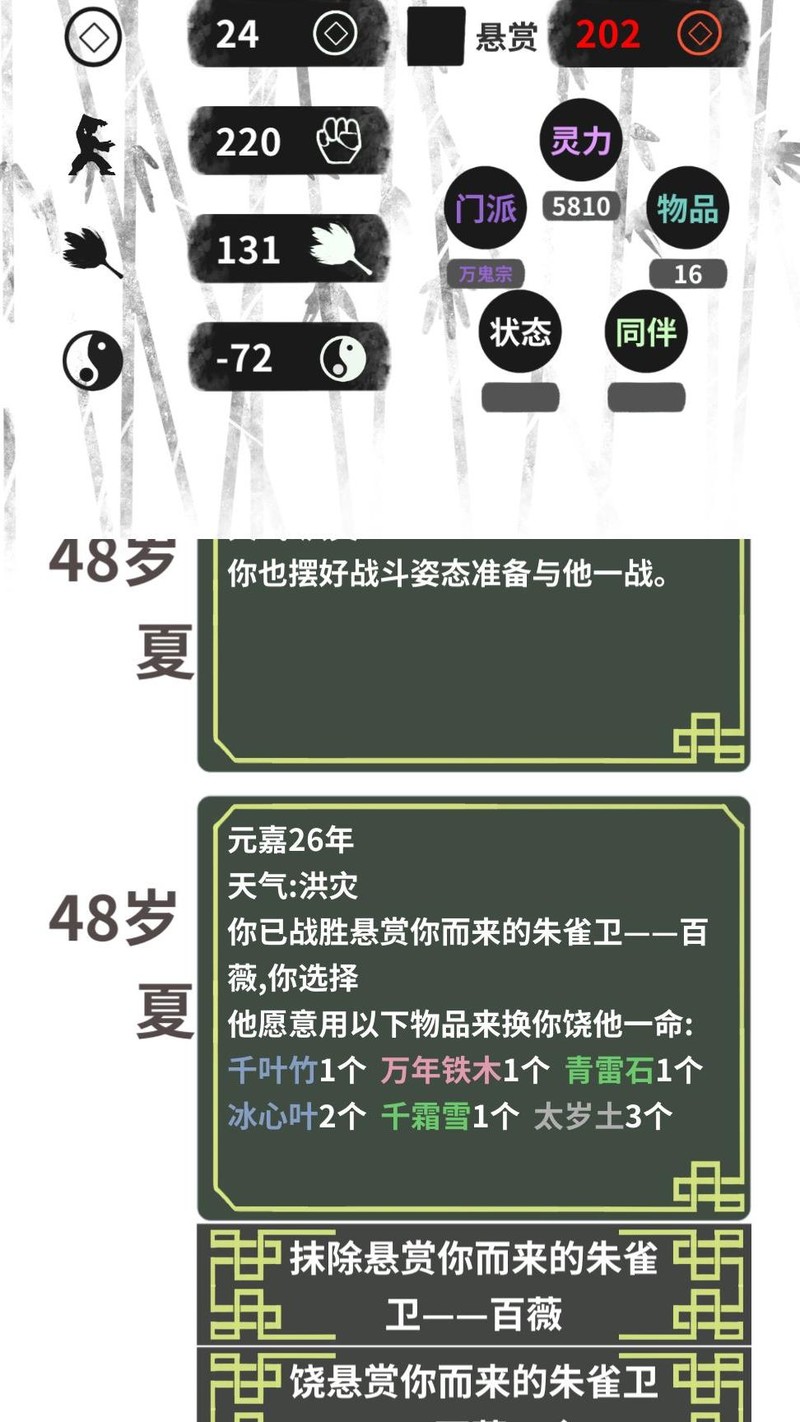 只要有钱就接任务,毫不畏惧;达到二百赏金后使用易容术,五十岁时属性至少六千,足以纵横天下,遇见强敌四相也直接开战。