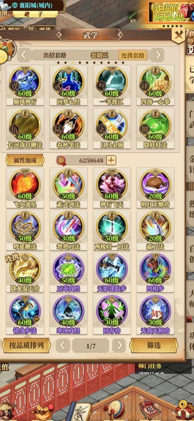 头七阶段的核心目标是争夺排名奖励,资源必须高效利用。战力直接影响排名,而战力会随上阵武学变化,因此建议配置两套阵容:一套日常使用,一套专用于提升战力。技能优先级为:金色高于紫色、蓝色、绿色;单体强于横排、纵排、斜排,与全体相当;轻功优于内功,内功优于外功;有组合加成的优先选择。推荐搭配双轻功、双内功和四外功来最大化战力。每日24点前切换至战力阵容,领取奖励后再换回常用阵容,确保资源不浪费,稳步提升排名。