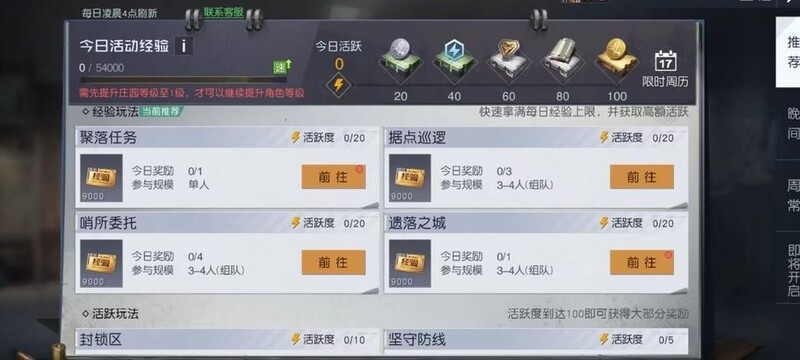 可尝试进入日程界面,系统已按类型整合了各类玩法,玩家只需根据推荐完成相应活动即可。此外,黎明觉醒:生机设有每日经验获取上限,开荒期间需注意此限制,合理安排游戏时间,避免过度投入造成效率浪费。