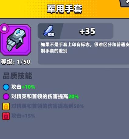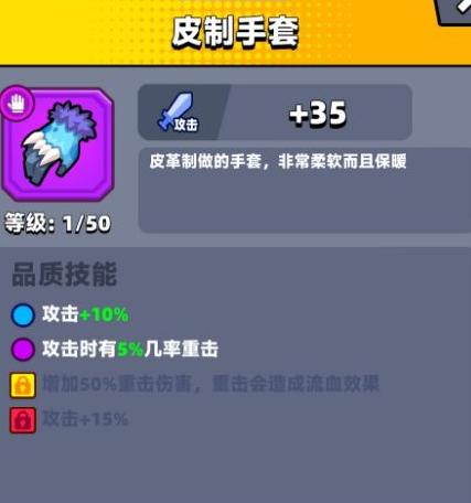 紫色品质的皮制手套在攻击时有5%暴击几率,升至金色后可提升50%重击伤害并附加流血效果。其特性与永恒手套相近,因而被称作小永恒。该手套特别适合搭配苦无使用,流血效果显著,对新手玩家而言是不错的选择,兼具实用性和成长性,值得尝试装备。