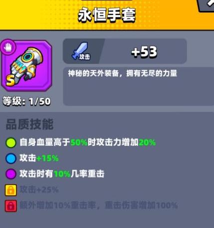 永恒手套在绿色品质时便展现出强势,当角色血量高于一半,可提升20%攻击力。升至紫色品质时性能大幅提升,建议搭配冷却时间短的武器以高频触发效果。一旦进阶为红色武器,实力彻底爆发,不仅重击率额外提升10%,且重击伤害直接翻倍,输出能力极为恐怖,堪称战力质变的巅峰装备。