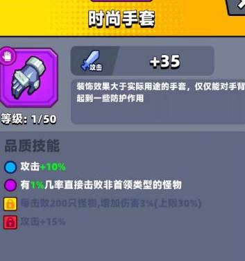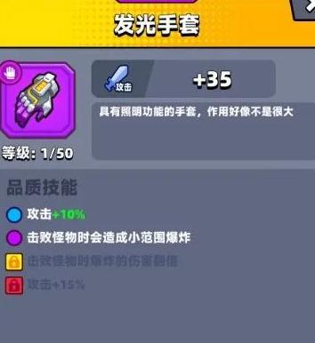 紫色品质的发光手套在击败怪物时会触发小范围爆炸,中期怪物密集分布,几乎无需担心无法命中。由于其伤害偏低,主要适用于清怪场景,在面对BOSS战时效果不明显,因此更适合用于刷怪场合。