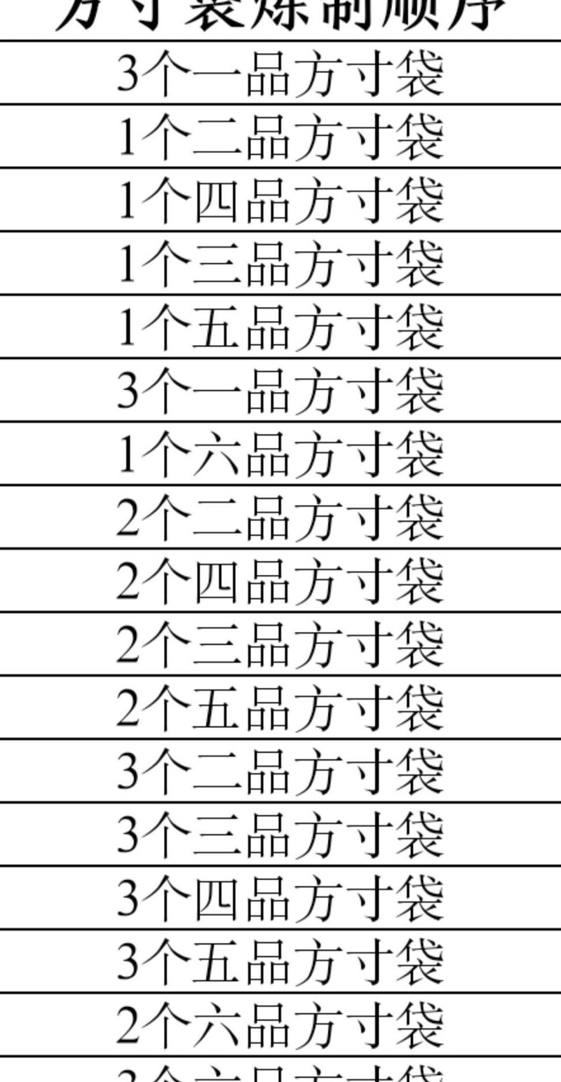 由于四至六星不产出金精,此顺序可确保金精与天柱石、月光石的产量协调一致,例如刷出一个二品方寸袋多出的金精,恰好满足炼制一个四品方寸袋所需。
