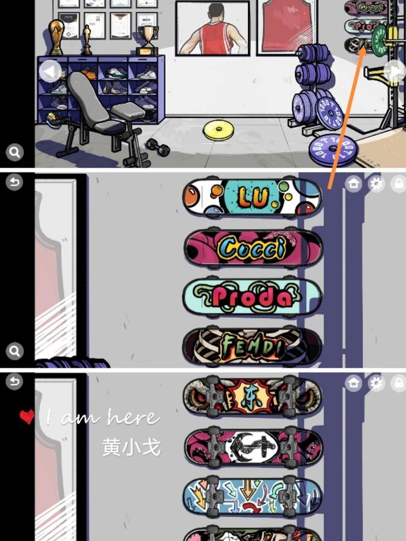 在一楼健身房,点击墙上滑板并翻转,获取方向提示:右、左、下、右。