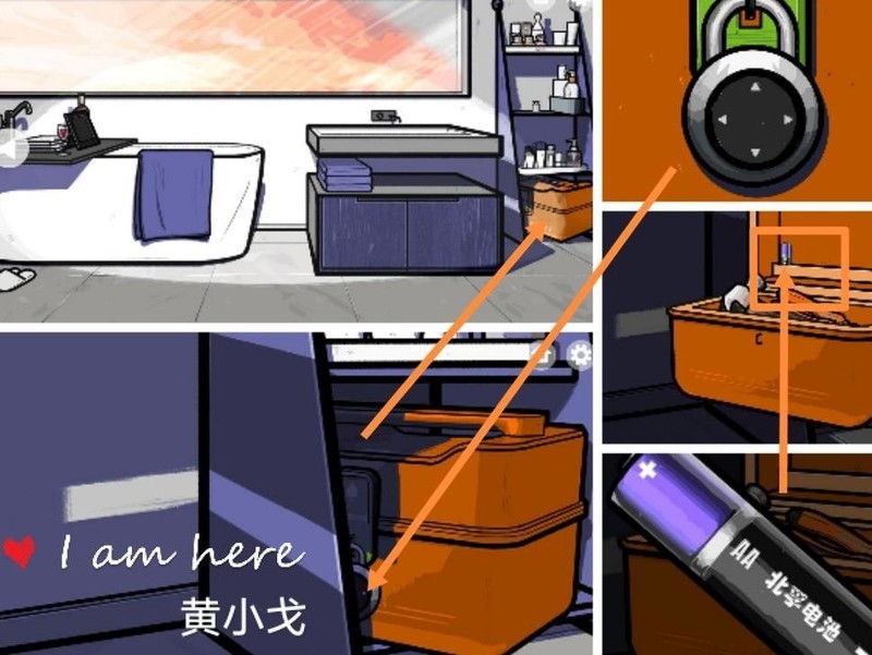 在二楼浴室,点击置物架下的箱子,按第一个线索移动黑色滑块,开启箱子取得电池。