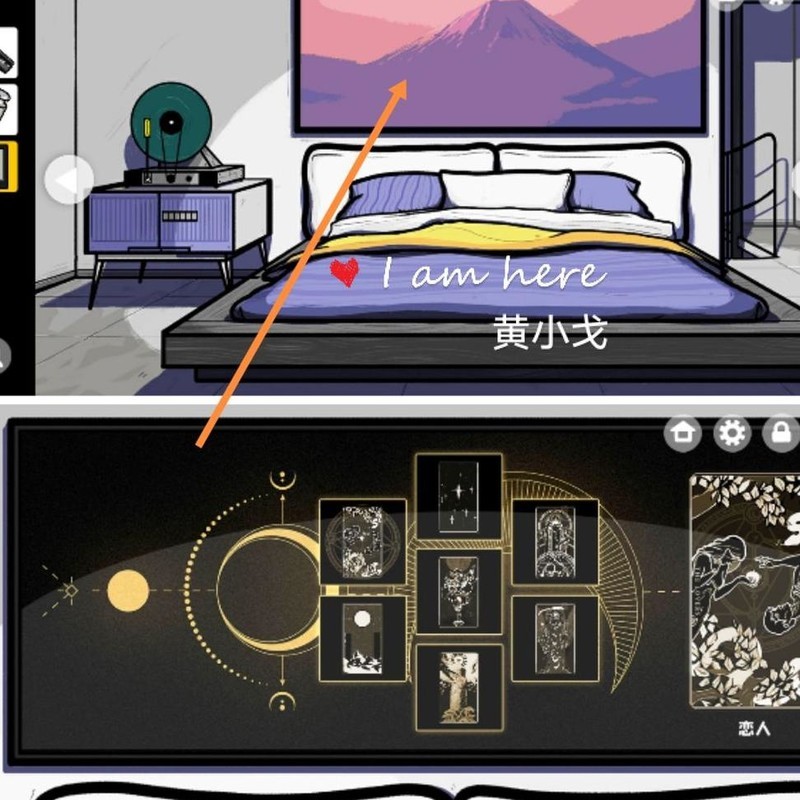 进入二楼卧室,点击床头壁画,依照泡面神器提示,将塔罗牌按顺序摆放:魔术师、愚人、月亮、死神、星星、恋人、高塔,方向为从左至右、从上到下。